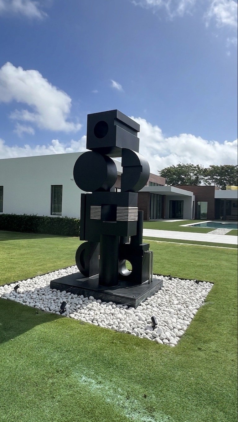 Crafted from weathering steel (also known as Corten or A588), this piece is designed to age gracefully outdoors without the need for paint. Shown here in a black patina finish, it can also be customized in other metals, finishes, or sizes—including bronze, stainless steel, or a color of your choice. Stainless steel accents add contrast, while natural oxidation will develop into a rich rust tone over time if left untreated.