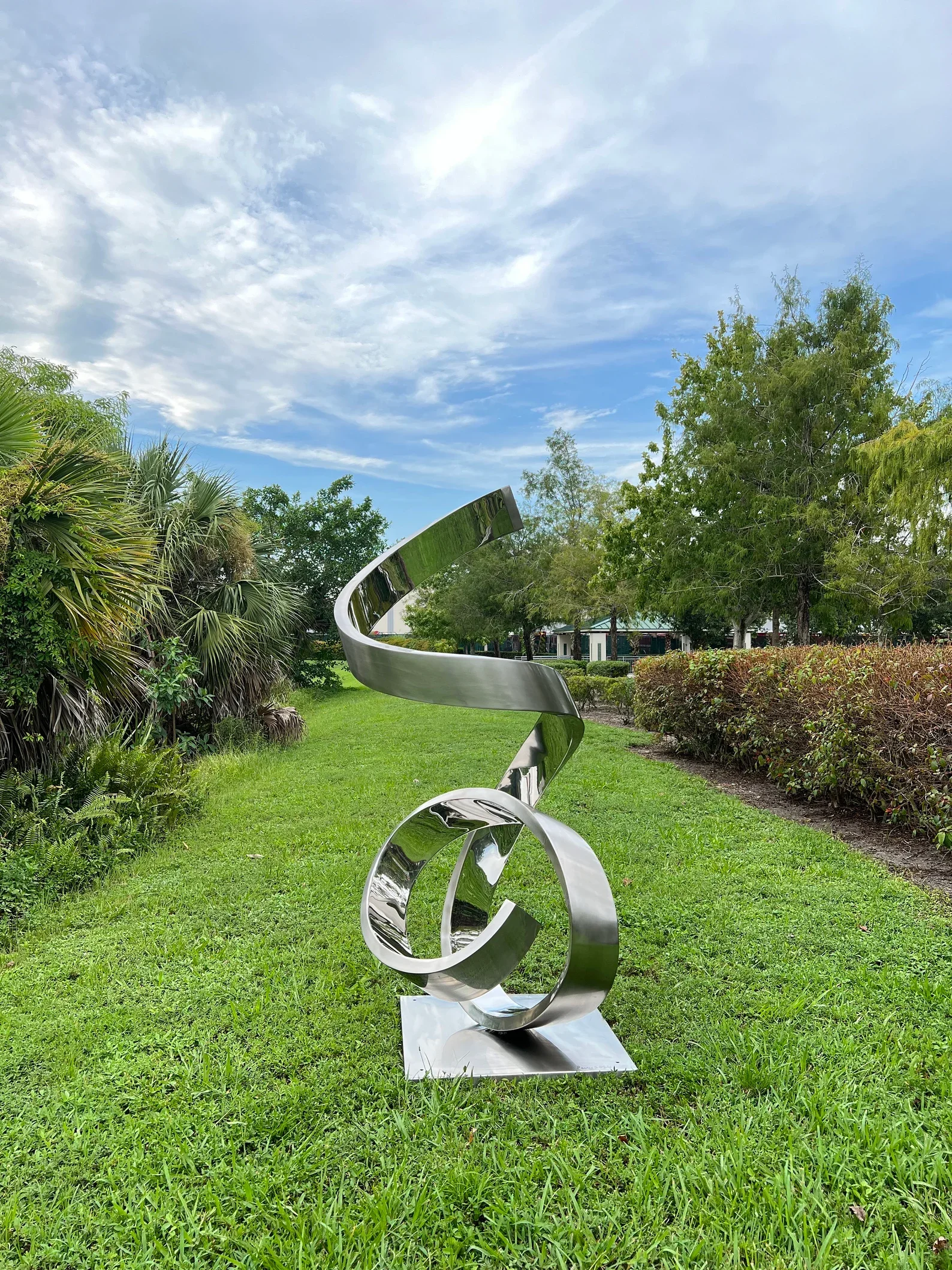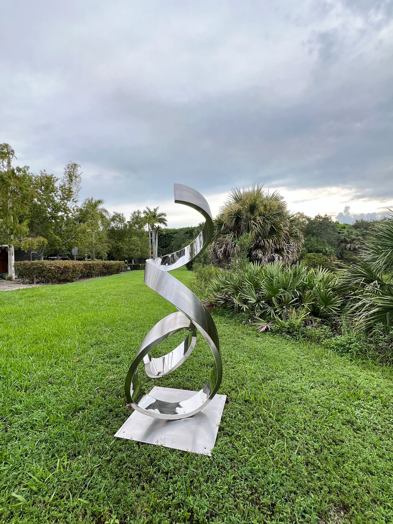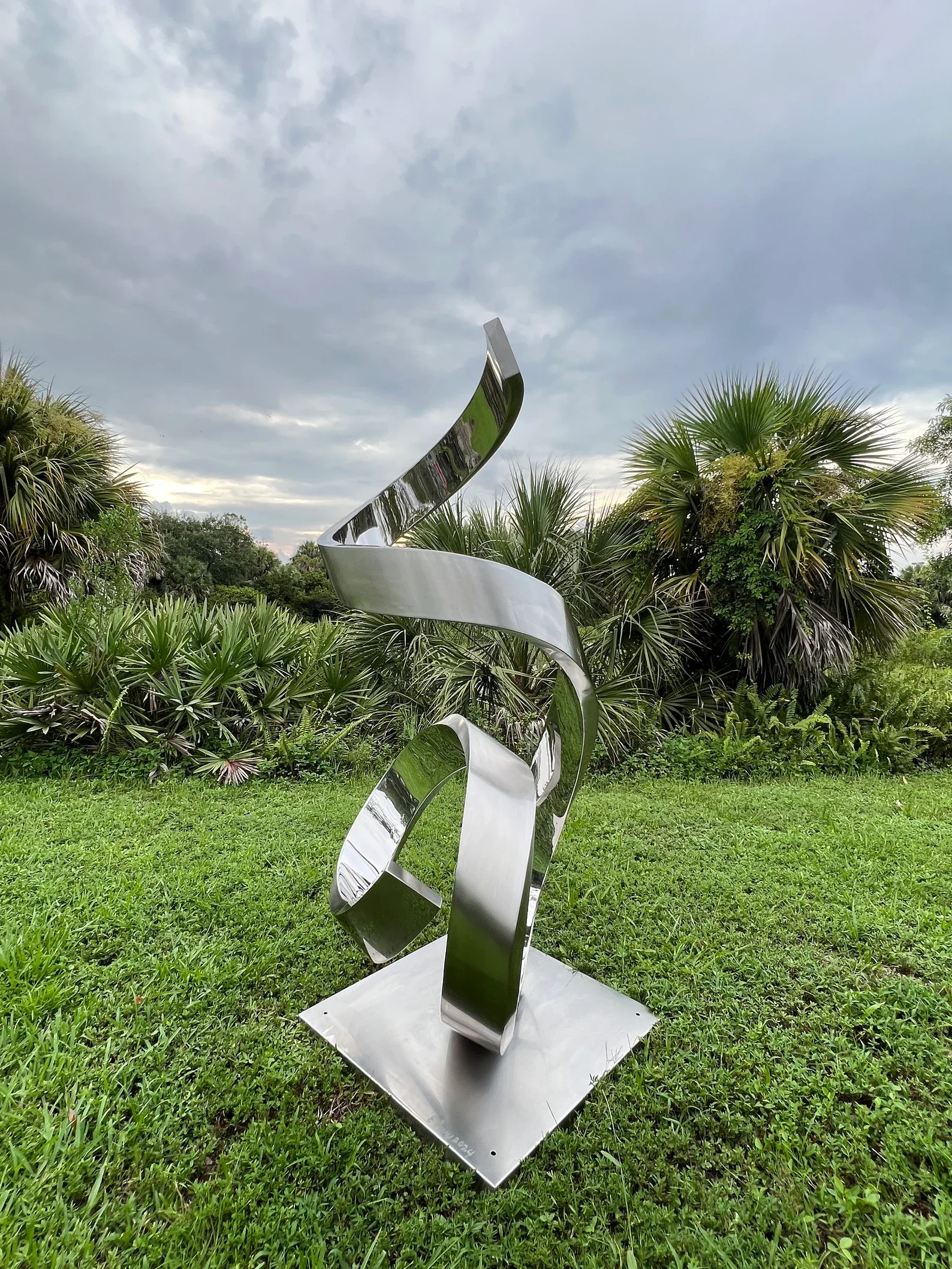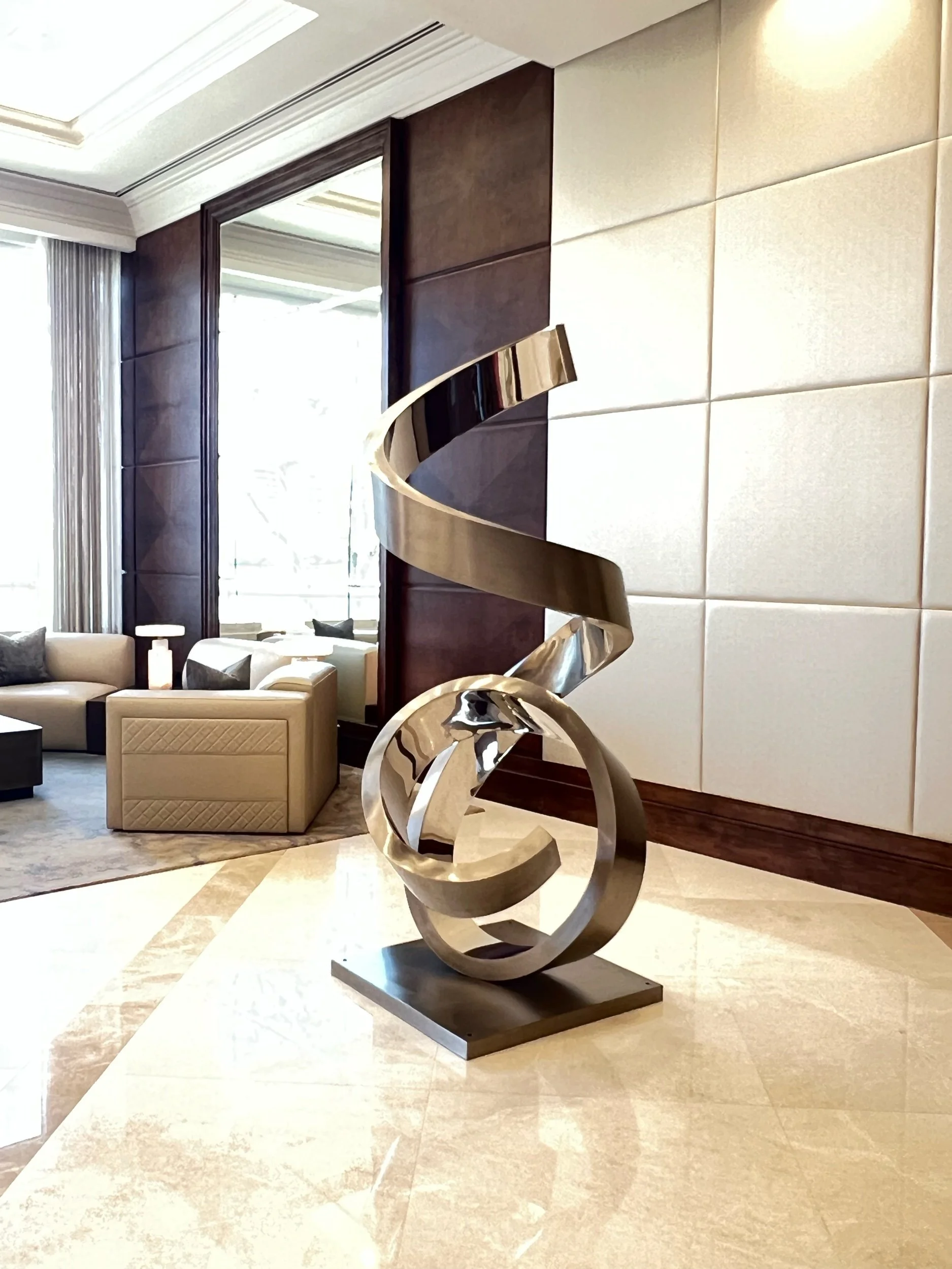 Eternal Ribbon flows in a continuous, sweeping form that symbolizes infinity and grace. Its elegant curves suggest timeless movement and unity, capturing attention from every angle. Crafted in stainless steel, the sculpture blends satin and high-polish finishes to reflect light beautifully and enhance its sculptural presence.
