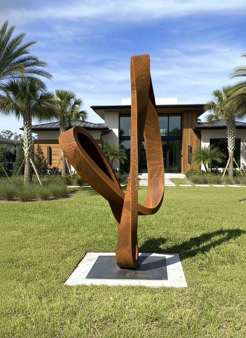 Möbius is inspired by the infinite loop of the Möbius strip, symbolizing unity and continuity. Crafted from Corten steel, it requires no maintenance. The rust forms only on the surface, developing a rich patina while preserving the structure beneath.